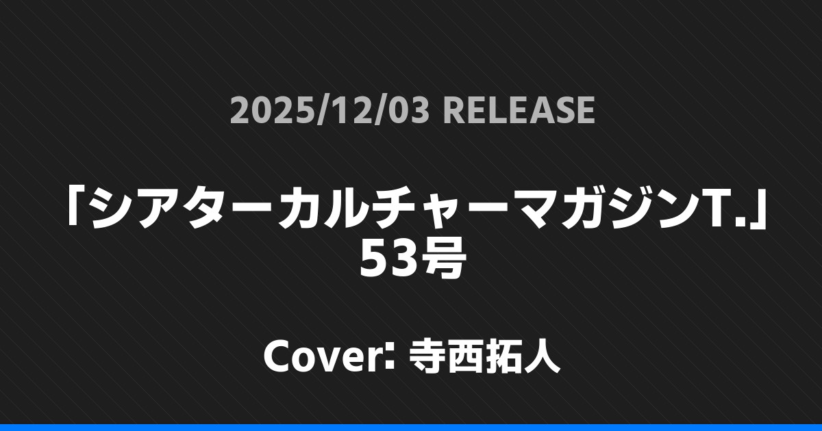 「シアターカルチャーマガジンT.」53号表紙は寺西拓人! timelesz 2026.01.24 ※本ページにはプロモーションが含まれています。 詳細情報 発売日:2025/12/03 表紙:寺西拓人 「シアターカルチャーマガジンT.」53号の表紙は寺西拓人さんです! 「anan」No.2474表紙はSnow Man(アンアンパンダver)! 「GQ JAPAN」1月号増刊 特別表紙版表紙はtimelesz! ホームtimelesz