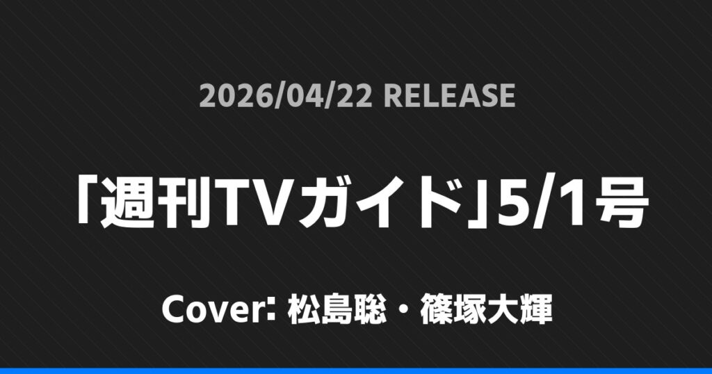 「週刊TVガイド」5/1号表紙は松島聡・篠塚大輝! timelesz 2026.04.01 ※本ページにはプロモーションが含まれています。 詳細情報 発売日:2026/04/22 表紙:松島聡・篠塚大輝 「週刊TVガイド」5/1号の表紙は松島聡・篠塚大輝さんです! スポンサーリンク 「Stagefan」Vol.54表紙は原嘉孝・橋本将生! 「AERA」5/4-11合併号表紙は原嘉孝・橋本将生! ホームtimelesz