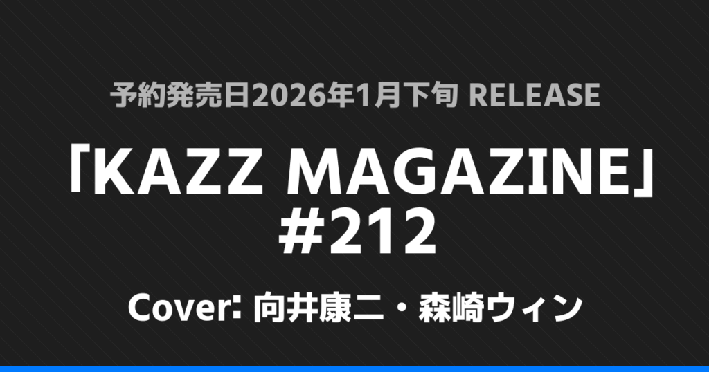 「KAZZ MAGAZINE」#212表紙は向井康二・森崎ウィン! Snow Man 2026.01.16 ※本ページにはプロモーションが含まれています。 商品リンク Amazon セブンネット タワーレコード 詳細情報 発売日:2026/01/25 表紙:向井康二・森崎ウィン 「KAZZ MAGAZINE」#212の表紙は向井康二・森崎ウィンさんです! 「+act.」4月号表紙は道枝駿佑! 「J Movie Magazine」Vol.127表紙は木村拓哉! ホームSnow Man