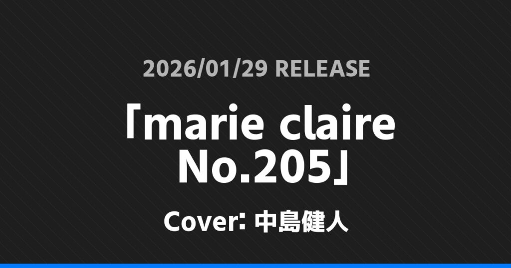 「marie claire No.205」表紙は中島健人! 無所属 2026.01.30 ※本ページにはプロモーションが含まれています。 詳細情報 発売日:2026/01/29 表紙:中島健人 「marie claire No.205」の表紙は中島健人さんです! 「月刊TVガイド」4月号表紙は岩本照・松田元太! 「PICT-UP」4月号表紙は佐久間大介! ホーム無所属