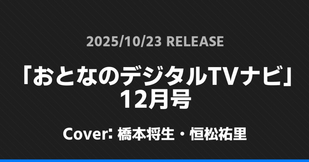 「おとなのデジタルTVナビ」12月号表紙は橋本将生・恒松祐里! timelesz 2026.01.24 ※本ページにはプロモーションが含まれています。 商品リンク Amazon 楽天ブックス セブンネット タワーレコード 詳細情報 発売日:2025/10/23 表紙:橋本将生・恒松祐里 「おとなのデジタルTVナビ」12月号の表紙は橋本将生・恒松祐里さんです! 「ヤングマガジン」11/24号表紙は原嘉孝・篠塚大輝! 「AERA」11/24号表紙は木村拓哉! ホームtimelesz