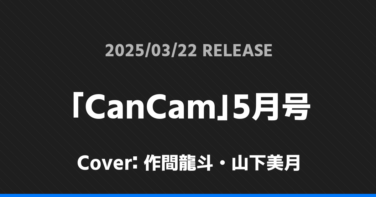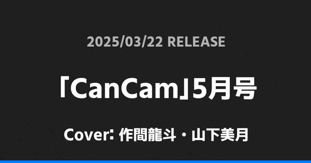 「CanCam」5月号表紙は作間龍斗・山下美月! ジュニア 2026.01.24 ※本ページにはプロモーションが含まれています。 商品リンク Amazon 楽天ブックス セブンネット タワーレコード 詳細情報 発売日:2025/03/22 表紙:作間龍斗・山下美月 「CanCam」5月号の表紙は作間龍斗・山下美月さんです! 「SPUR」5月号特別版松田元太表紙版表紙は松田元太! 「VOCE」5月号SPECIAL増刊表紙は寺西拓人! ホームジュニア