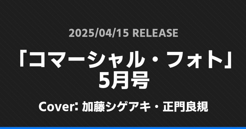 「コマーシャル・フォト」5月号表紙は加藤シゲアキ・正門良規! Aぇ! group 2026.01.24 ※本ページにはプロモーションが含まれています。 商品リンク Amazon 楽天ブックス セブンネット タワーレコード 詳細情報 発売日:2025/04/15 表紙:加藤シゲアキ・正門良規 「コマーシャル・フォト」5月号の表紙は加藤シゲアキ・正門良規さんです! 「月刊わんこ」vol.17表紙は中間淳太! 「ベース・マガジン」5月号表紙は矢花黎・亀田誠治! ホームAぇ! group