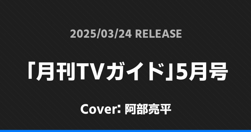 「月刊TVガイド」5月号表紙は阿部亮平! Snow Man 2026.01.24 ※本ページにはプロモーションが含まれています。 商品リンク Amazon 楽天ブックス セブンネット タワーレコード 詳細情報 発売日:2025/03/24 表紙:阿部亮平 「月刊TVガイド」5月号の表紙は阿部亮平さんです! 「月刊スカパー」4月号表紙は長尾謙杜! 「デジタルTVガイド」5月号表紙は松田元太! ホームSnow Man