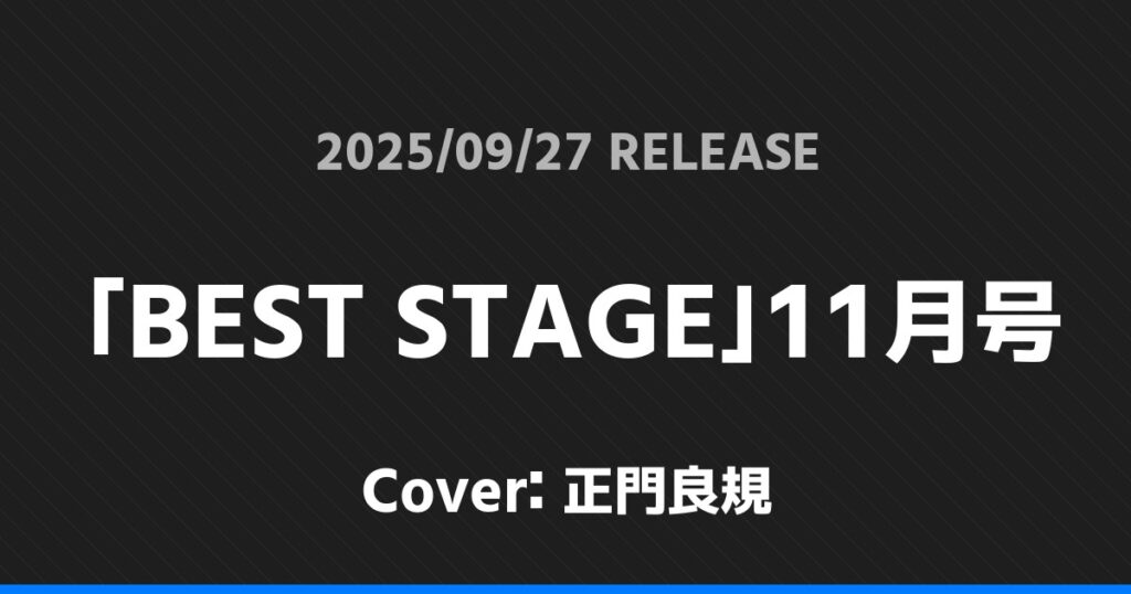 「BEST STAGE」11月号表紙は正門良規! Aぇ! group 2026.01.24 ※本ページにはプロモーションが含まれています。 商品リンク Amazon 楽天ブックス セブンネット タワーレコード 詳細情報 発売日:2025/09/27 表紙:正門良規 「BEST STAGE」11月号の表紙は正門良規さんです! 「GIANNA ISSUE16」SPECIAL EDITION版表紙は宮舘涼太! 「Hanako」11月号表紙は櫻井翔! ホームAぇ! group