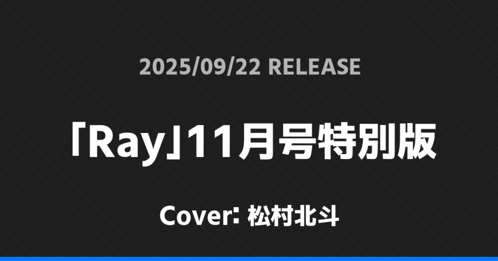 「Ray」11月号特別版表紙は松村北斗! SixTONES 2026.01.24 ※本ページにはプロモーションが含まれています。 商品リンク Amazon 楽天ブックス セブンネット タワーレコード 詳細情報 発売日:2025/09/22 表紙:松村北斗 「Ray」11月号特別版の表紙は松村北斗さんです! 「BARFOUT!」10月号表紙は松村北斗! 「VOCE」11月号増刊表紙は渡辺翔太! ホームSixTONES