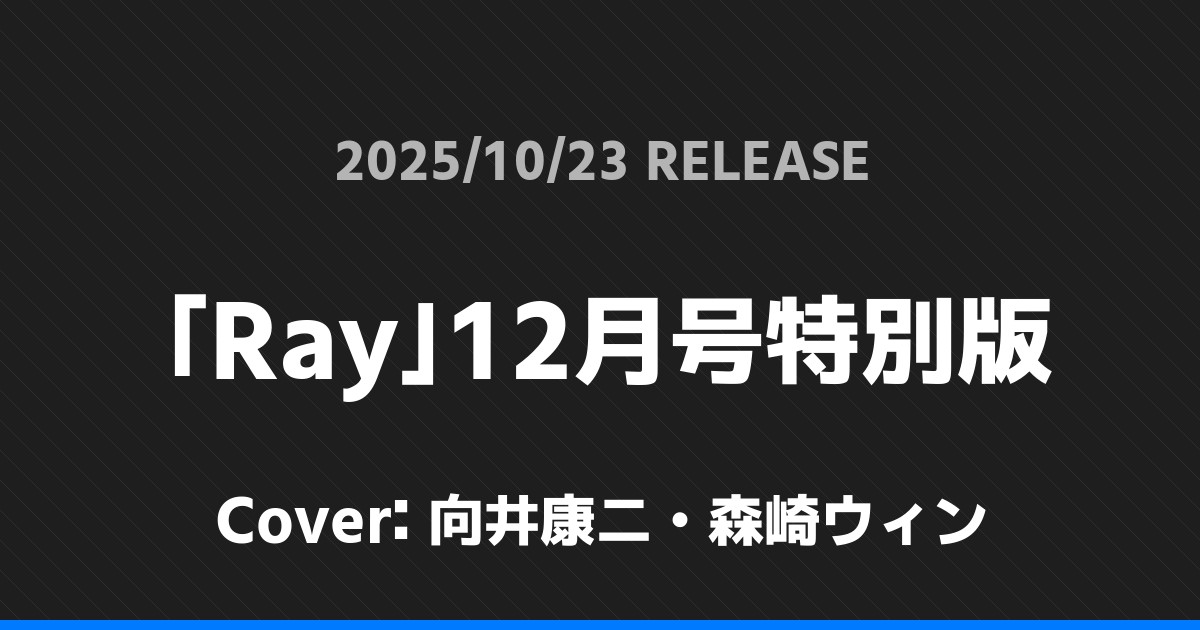 「Ray」12月号特別版表紙は向井康二・森崎ウィン! timelesz 2026.01.24 ※本ページにはプロモーションが含まれています。 商品リンク Amazon 楽天ブックス セブンネット タワーレコード 詳細情報 発売日:2025/10/23 表紙:向井康二・森崎ウィン 「Ray」12月号特別版の表紙は向井康二・森崎ウィンさんです! 「CanCam」12月号特別版表紙は中島健人! 「週刊TVガイド」10/31号表紙は猪俣周杜・篠塚大輝! ホームtimelesz
