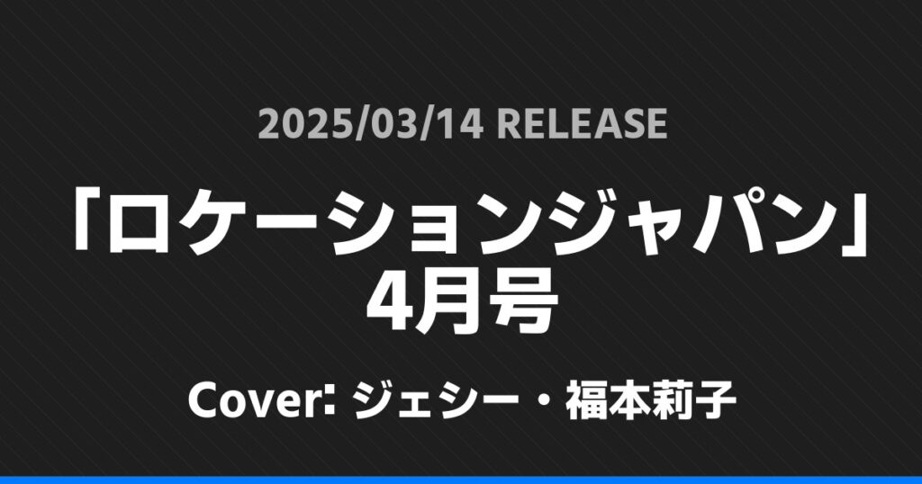 「ロケーションジャパン」4月号表紙はジェシー・福本莉子! SixTONES 2026.01.24 ※本ページにはプロモーションが含まれています。 商品リンク Amazon 楽天ブックス セブンネット タワーレコード 詳細情報 発売日:2025/03/14 表紙:ジェシー・福本莉子 「ロケーションジャパン」4月号の表紙はジェシー・福本莉子さんです! 「QLAP!」4月号表紙は松田元太! 「S Cawaii!」5月号表紙は長尾謙杜! ホームSixTONES