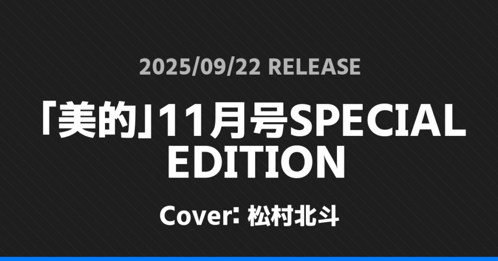 「美的」11月号SPECIAL EDITION表紙は松村北斗! SixTONES 2026.01.24 ※本ページにはプロモーションが含まれています。 商品リンク Amazon 楽天ブックス セブンネット タワーレコード 詳細情報 発売日:2025/09/22 表紙:松村北斗 「美的」11月号SPECIAL EDITIONの表紙は松村北斗さんです! 「Myojo」11月号表紙はTravis Japan! 「MAQUIA」11月号特別版表紙は橋本将生! ホームSixTONES