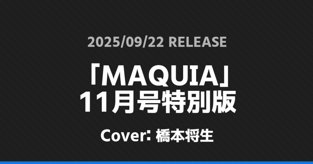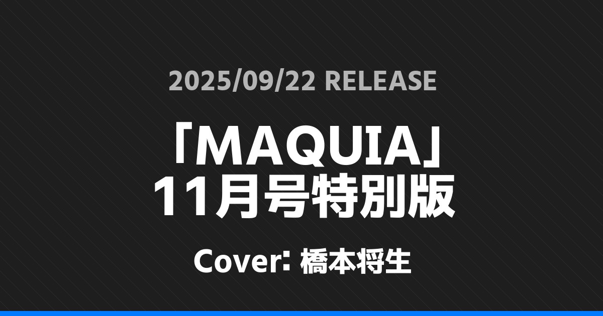 「MAQUIA」11月号特別版表紙は橋本将生! timelesz 2026.01.24 ※本ページにはプロモーションが含まれています。 商品リンク Amazon 楽天ブックス セブンネット タワーレコード 詳細情報 発売日:2025/09/22 表紙:橋本将生 「MAQUIA」11月号特別版の表紙は橋本将生さんです! 「美的」11月号SPECIAL EDITION表紙は松村北斗! 「SPRiNG」11月号表紙は宮舘涼太! ホームtimelesz