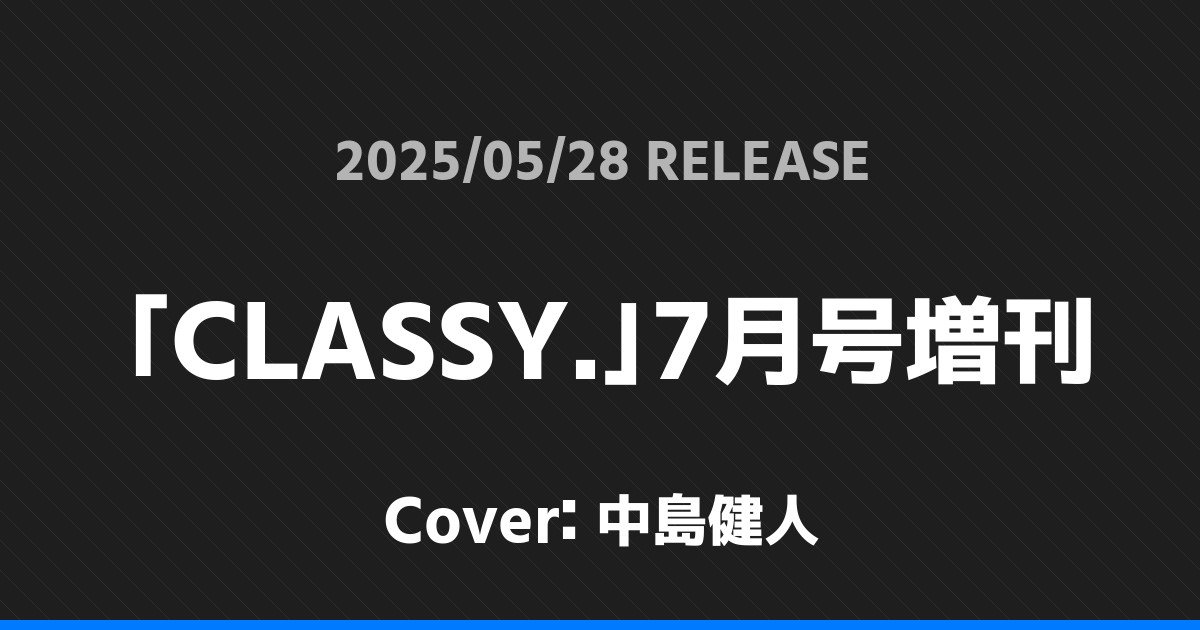 「CLASSY.」7月号増刊表紙は中島健人! 無所属 2026.01.24 ※本ページにはプロモーションが含まれています。 商品リンク Amazon 楽天ブックス セブンネット タワーレコード 詳細情報 発売日:2025/05/28 表紙:中島健人 「CLASSY.」7月号増刊の表紙は中島健人さんです! 「Numero TOKYO」7月号特装版表紙は髙橋海人! 「BAILA」7月号増刊 timelesz表紙版表紙はtimelesz! ホーム無所属
