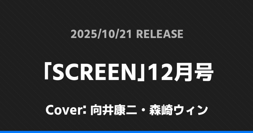 「SCREEN」12月号表紙は向井康二・森崎ウィン! Snow Man 2026.01.24 ※本ページにはプロモーションが含まれています。 商品リンク Amazon 楽天ブックス セブンネット タワーレコード 詳細情報 発売日:2025/10/21 表紙:向井康二・森崎ウィン 「SCREEN」12月号の表紙は向井康二・森崎ウィンさんです! 「美的」12月号SPECIAL EDITION表紙は大橋和也! 「FLIX」12月号表紙は木村拓哉! ホームSnow Man