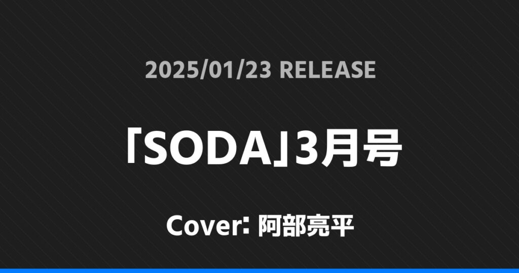 「SODA」3月号表紙は阿部亮平! Snow Man 2026.01.24 ※本ページにはプロモーションが含まれています。 商品リンク Amazon 楽天ブックス セブンネット タワーレコード 詳細情報 発売日:2025/01/23 表紙:阿部亮平 「SODA」3月号の表紙は阿部亮平さんです! 「awesome! Plus」Vol.35表紙は永瀬廉! 「BARFOUT!」2月号表紙は目黒蓮! ホームSnow Man