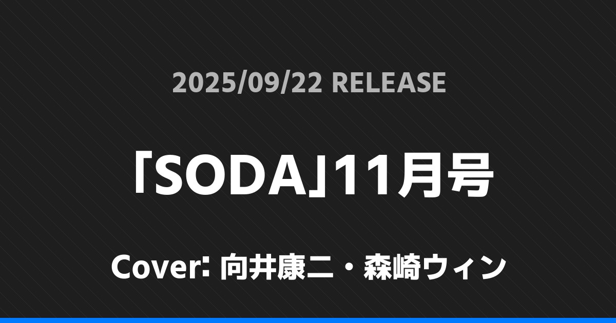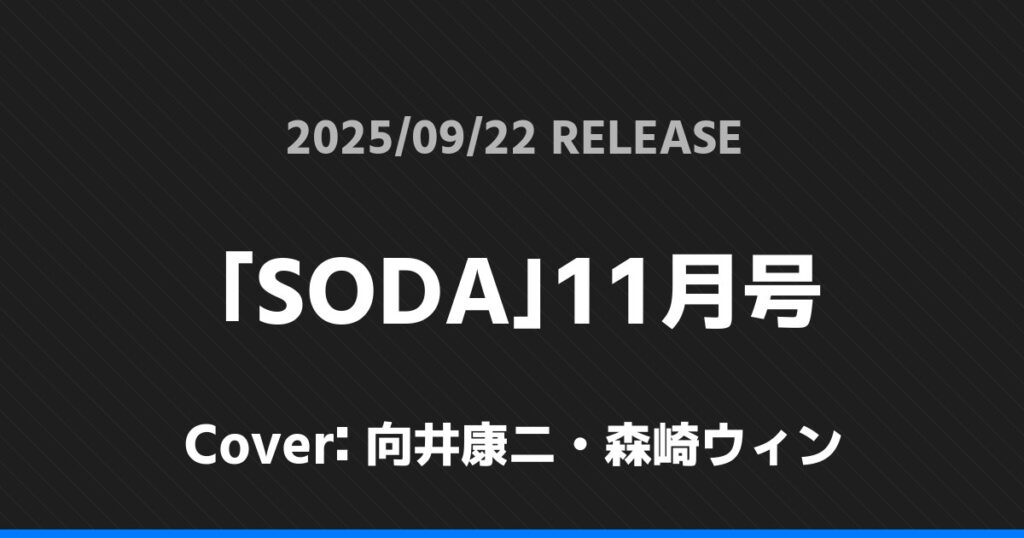 「SODA」11月号表紙は向井康二・森崎ウィン! Snow Man 2026.01.24 ※本ページにはプロモーションが含まれています。 商品リンク Amazon 楽天ブックス セブンネット タワーレコード 詳細情報 発売日:2025/09/22 表紙:向井康二・森崎ウィン 「SODA」11月号の表紙は向井康二・森崎ウィンさんです! 「日本映画navi」vol.119表紙は宮舘涼太・水上恒司! 「BARFOUT!」10月号表紙は松村北斗! ホームSnow Man