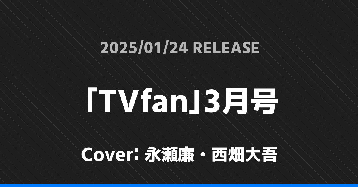 「TVfan」3月号表紙は永瀬廉・西畑大吾! King & Prince 2026.01.24 ※本ページにはプロモーションが含まれています。 商品リンク Amazon 楽天ブックス セブンネット タワーレコード 詳細情報 発売日:2025/01/24 表紙:永瀬廉・西畑大吾 「TVfan」3月号の表紙は永瀬廉・西畑大吾さんです! 「月刊ザテレビジョン」3月号表紙は松村北斗! 「GOETHE」3月号表紙は目黒蓮! ホームKing & Prince