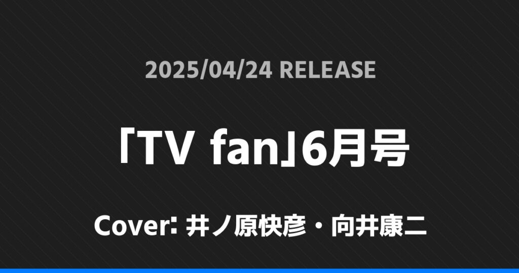 「TV fan」6月号表紙は井ノ原快彦・向井康二! 20th Century 2026.01.24 ※本ページにはプロモーションが含まれています。 商品リンク Amazon 楽天ブックス セブンネット タワーレコード 詳細情報 発売日:2025/04/24 表紙:井ノ原快彦・向井康二 「TV fan」6月号の表紙は井ノ原快彦・向井康二さんです! 「おとなのデジタルTVナビ」6月号表紙は田中樹・木村文乃! 「月刊TVガイド」6月号表紙は井ノ原快彦・向井康二! ホーム20th Century