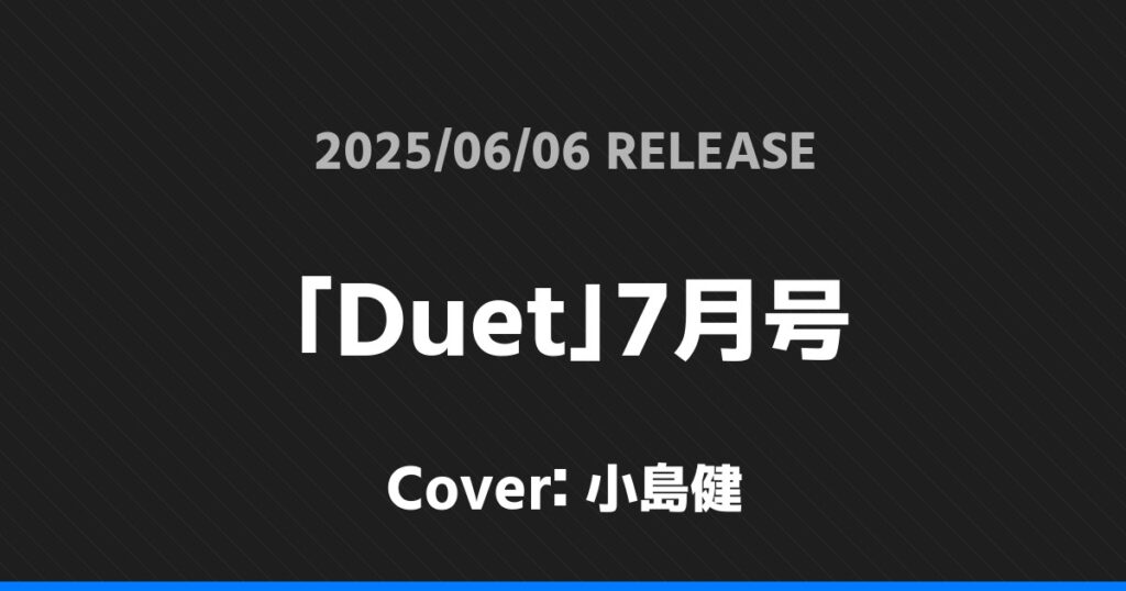 「Duet」7月号表紙は小島健! Aぇ! group 2026.01.24 ※本ページにはプロモーションが含まれています。 商品リンク Amazon 楽天ブックス セブンネット タワーレコード 詳細情報 発売日:2025/06/06 表紙:小島健 「Duet」7月号の表紙は小島健さんです! 「andGIRL2025年夏号増刊」表紙は中島裕翔! 「ダ・ヴィンチ」7月号表紙は寺西拓人! ホームAぇ! group
