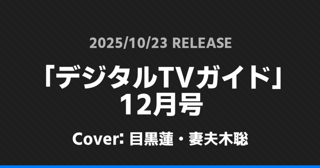 「デジタルTVガイド」12月号表紙は目黒蓮・妻夫木聡! Snow Man 2026.01.24 ※本ページにはプロモーションが含まれています。 商品リンク Amazon 楽天ブックス セブンネット タワーレコード 詳細情報 発売日:2025/10/23 表紙:目黒蓮・妻夫木聡 「デジタルTVガイド」12月号の表紙は目黒蓮・妻夫木聡さんです! 「月刊TVnavi」12月号表紙は松島聡・猪俣周杜! 「月刊TVガイド」12月号表紙は目黒蓮・妻夫木聡! ホームSnow Man