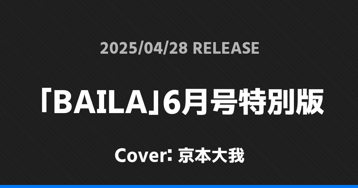 「BAILA」6月号特別版表紙は京本大我! SixTONES 2026.01.24 ※本ページにはプロモーションが含まれています。 商品リンク Amazon 楽天ブックス セブンネット タワーレコード 詳細情報 発売日:2025/04/28 表紙:京本大我 「BAILA」6月号特別版の表紙は京本大我さんです! 「NYLON JAPAN」6月号表紙は菊池風磨・大森元貴! 「Mgirl No.36」表紙はラウール! ホームSixTONES
