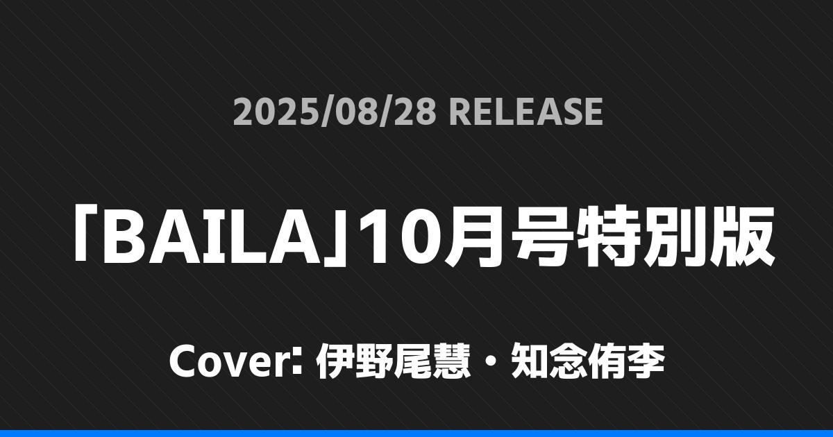「BAILA」10月号特別版表紙は伊野尾慧・知念侑李! Hey! Say! JUMP 2026.01.24 ※本ページにはプロモーションが含まれています。 商品リンク Amazon 楽天ブックス セブンネット タワーレコード 詳細情報 発売日:2025/08/28 表紙:伊野尾慧・知念侑李 「BAILA」10月号特別版の表紙は伊野尾慧・知念侑李さんです! 「FINEBOYS+plus OYASUMI」表紙は原嘉孝! 「BESTSTAGE」10月号表紙は原嘉孝! ホームHey! Say! JUMP
