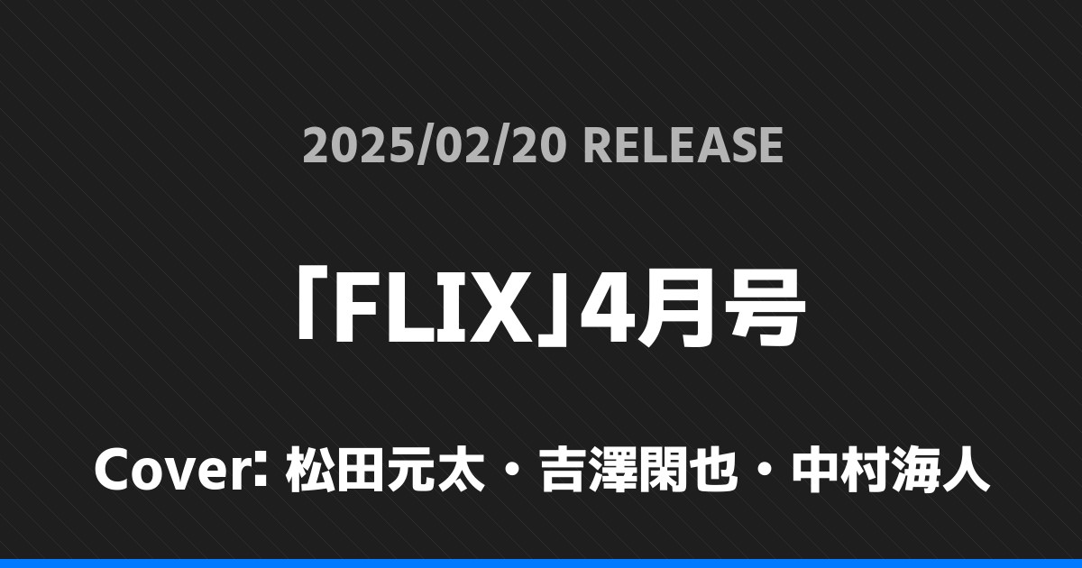 「FLIX」4月号表紙は松田元太・吉澤閑也・中村海人! Travis Japan 2026.01.24 ※本ページにはプロモーションが含まれています。 商品リンク Amazon 楽天ブックス セブンネット タワーレコード 詳細情報 発売日:2025/02/20 表紙:松田元太・吉澤閑也・中村海人 「FLIX」4月号の表紙は松田元太・吉澤閑也・中村海人さんです! 「non-no」4月号特別版表紙は道枝駿佑! 「美的」4月号SPECIAL EDITION表紙は七五三掛龍也! ホームTravis Japan
