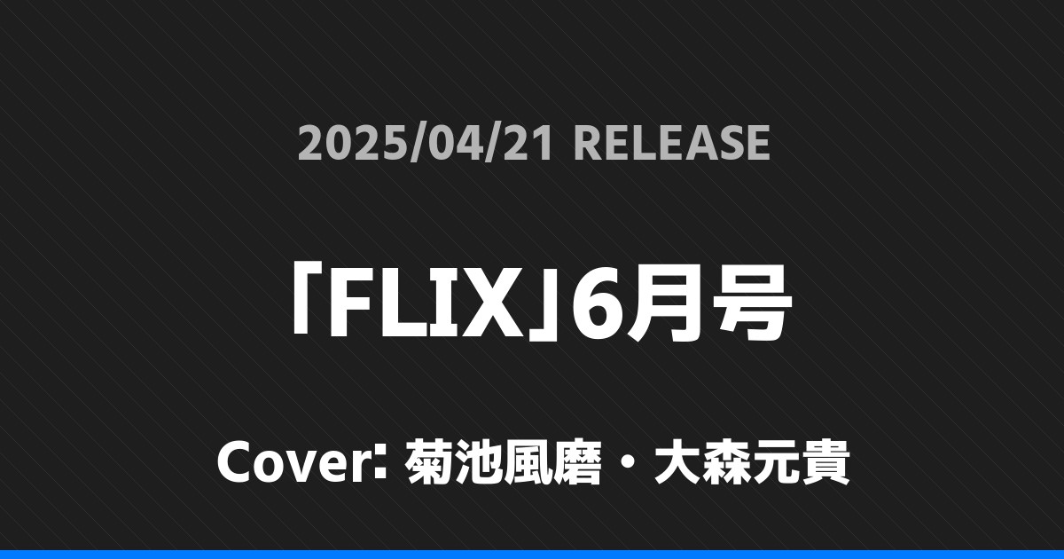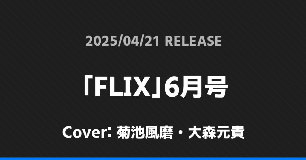 「FLIX」6月号表紙は菊池風磨・大森元貴! timelesz 2026.01.24 ※本ページにはプロモーションが含まれています。 商品リンク Amazon 楽天ブックス セブンネット タワーレコード 詳細情報 発売日:2025/04/21 表紙:菊池風磨・大森元貴 「FLIX」6月号の表紙は菊池風磨・大森元貴さんです! 「東京カレンダー」6月号特別増刊表紙は岩本照! 「週刊TVガイド」5/2号表紙は髙地優吾・戸次重幸・菅田琳寧・元木湧・ 松尾龍・真弓孟之! ホームtimelesz