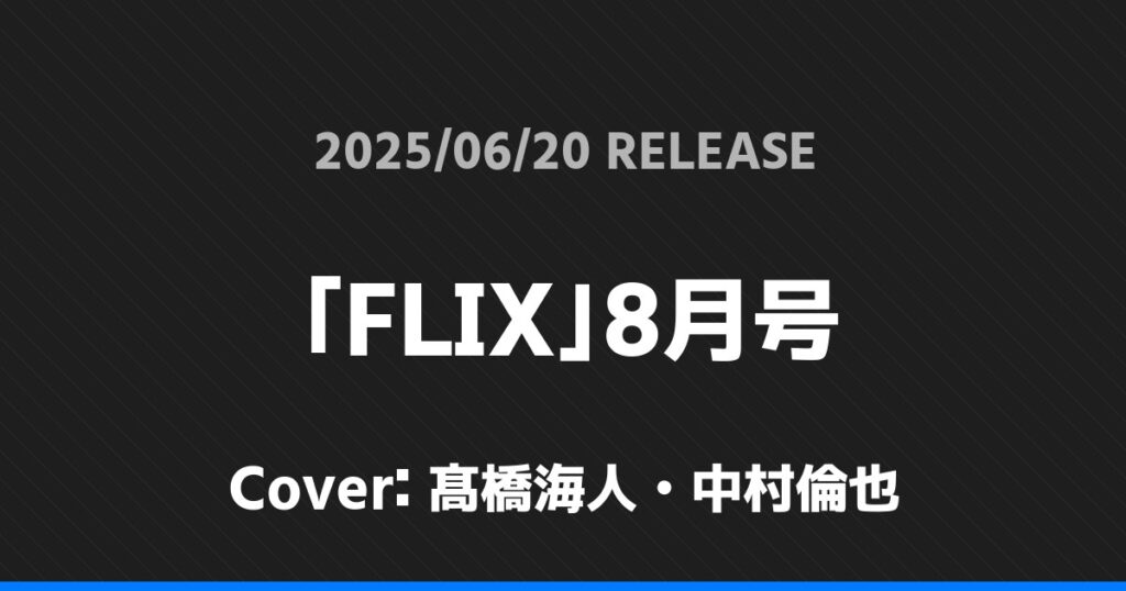 「FLIX」8月号表紙は髙橋海人・中村倫也! King & Prince 2026.01.24 ※本ページにはプロモーションが含まれています。 商品リンク Amazon 楽天ブックス セブンネット タワーレコード 詳細情報 発売日:2025/06/20 表紙:髙橋海人・中村倫也 「FLIX」8月号の表紙は髙橋海人・中村倫也さんです! 「Myojo」8月号表紙は表紙:ACEes 裏表紙:中村嶺亜! 「月刊TVnavi」8月号表紙は大橋和也・渋谷凪咲! ホームKing & Prince