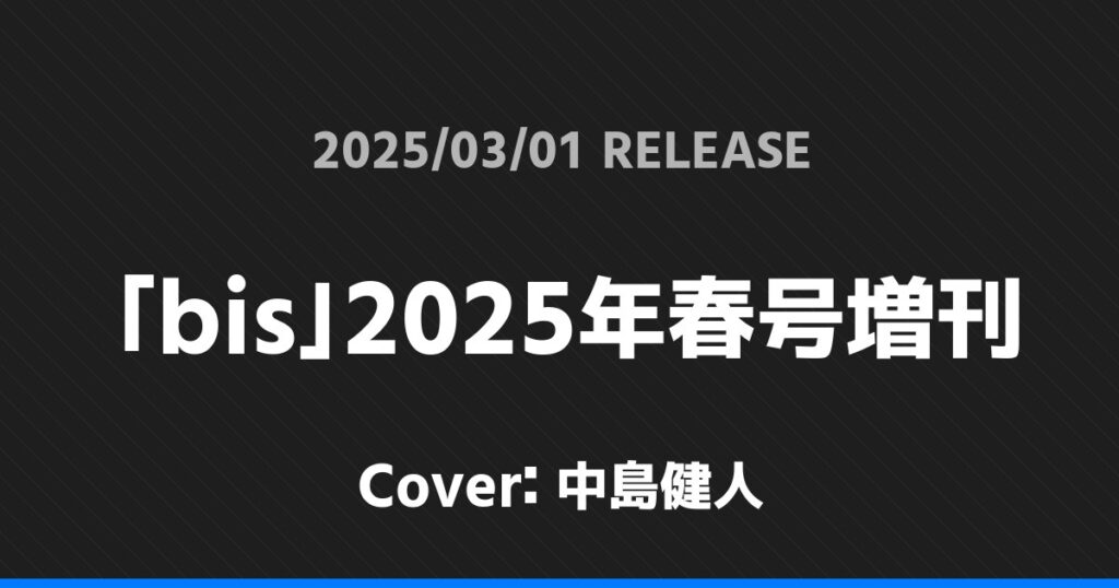 「bis」2025年春号増刊表紙は中島健人! 無所属 2026.01.24 ※本ページにはプロモーションが含まれています。 商品リンク Amazon 楽天ブックス セブンネット タワーレコード 詳細情報 発売日:2025/03/01 表紙:中島健人 「bis」2025年春号増刊の表紙は中島健人さんです! 「Men’s PREPPY」4月号表紙は松倉海斗! 「Eye-Ai」3、4月合併号表紙は松倉海斗! ホーム無所属