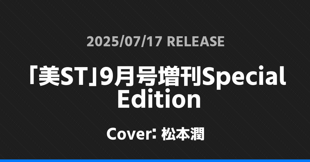 「美ST」9月号増刊Special Edition表紙は松本潤! 嵐 2026.01.24 ※本ページにはプロモーションが含まれています。 商品リンク Amazon 楽天ブックス セブンネット タワーレコード 詳細情報 発売日:2025/07/17 表紙:松本潤 「美ST」9月号増刊Special Editionの表紙は松本潤さんです! 「Eye-Ai+」vol.10表紙は宮近海斗・七五三掛龍也・川島如恵留! 「週刊TVガイド」7/25号表紙は深澤辰哉・斎藤工・永尾柚乃! ホーム嵐
