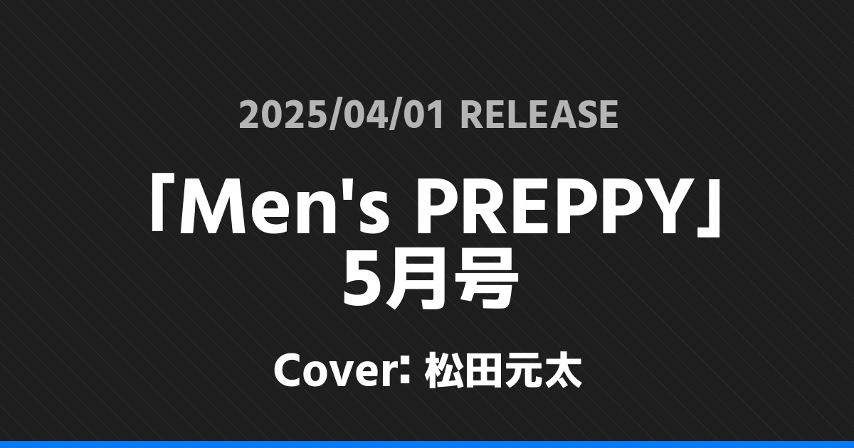 「Men’s PREPPY」5月号表紙は松田元太! Travis Japan 2026.01.24 ※本ページにはプロモーションが含まれています。 商品リンク Amazon 楽天ブックス セブンネット タワーレコード 詳細情報 発売日:2025/04/01 表紙:松田元太 「Men’s PREPPY」5月号の表紙は松田元太さんです! 「J Movie Magazine」Vol.117表紙は阿部亮平! 「anan」No.2441表紙は菊池風磨・大森元貴! ホームTravis Japan