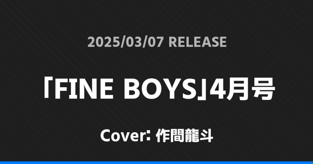 「FINE BOYS」4月号表紙は作間龍斗! ジュニア 2026.01.24 ※本ページにはプロモーションが含まれています。 商品リンク Amazon 楽天ブックス セブンネット タワーレコード 詳細情報 発売日:2025/03/07 表紙:作間龍斗 「FINE BOYS」4月号の表紙は作間龍斗さんです! 「andGIRL2025年春号増刊」表紙は宮近海斗・松倉海斗・七五三掛龍也! 「Duet」4月号表紙はKing & Prince! ホームジュニア