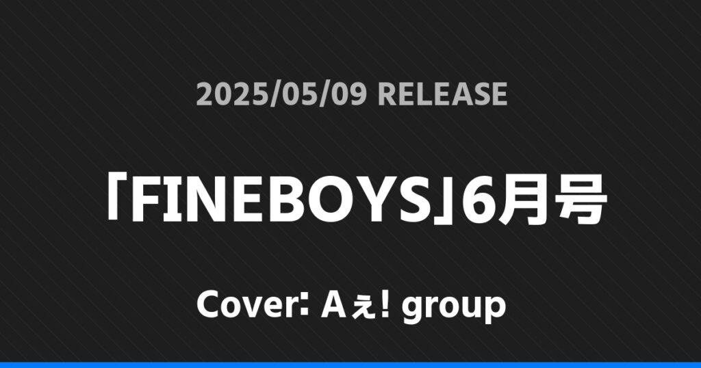 「FINEBOYS」6月号表紙はAぇ! group! Aぇ! group 2026.01.24 ※本ページにはプロモーションが含まれています。 商品リンク Amazon 楽天ブックス セブンネット タワーレコード 詳細情報 発売日:2025/05/09 表紙:Aぇ! group 「FINEBOYS」6月号の表紙はAぇ! groupさんです! 「Casa BRUTUS」6月号表紙は櫻井翔! 「MEN’S NON-NO」6月号表紙は中島裕翔・道枝駿佑! ホームAぇ! group