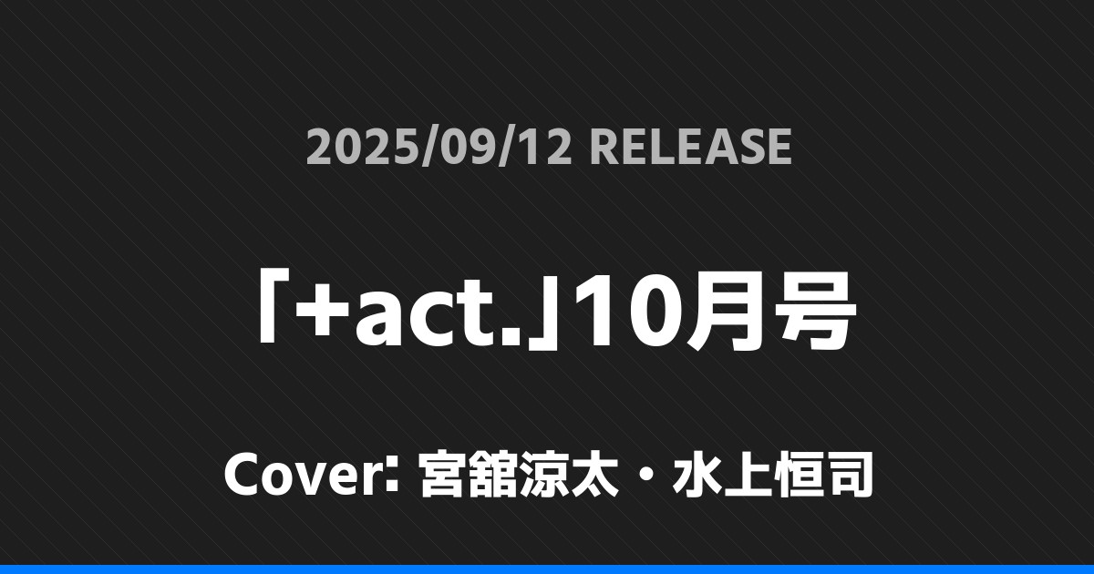 「+act.」10月号表紙は宮舘涼太・水上恒司! Snow Man 2026.01.24 ※本ページにはプロモーションが含まれています。 商品リンク Amazon 楽天ブックス セブンネット タワーレコード 詳細情報 発売日:2025/09/12 表紙:宮舘涼太・水上恒司 「+act.」10月号の表紙は宮舘涼太・水上恒司さんです! 「QLAP!」10月号表紙は向井康二・森崎ウィン! 「別冊マーガレット」10月号表紙は大橋和也! ホームSnow Man