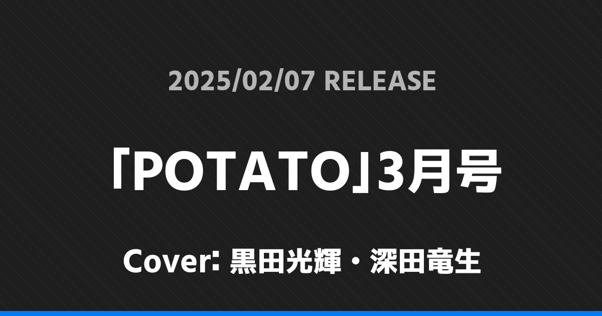 「POTATO」3月号表紙は黒田光輝・深田竜生! ジュニア 2026.01.24 ※本ページにはプロモーションが含まれています。 商品リンク Amazon 楽天ブックス セブンネット タワーレコード 詳細情報 発売日:2025/02/07 表紙:黒田光輝・深田竜生 「POTATO」3月号の表紙は黒田光輝・深田竜生さんです! 「MEN’S NON-NO」3月号特別版表紙は道枝駿佑! 「ビッグコミック」2/25号表紙は目黒蓮・佐野勇斗! ホームジュニア