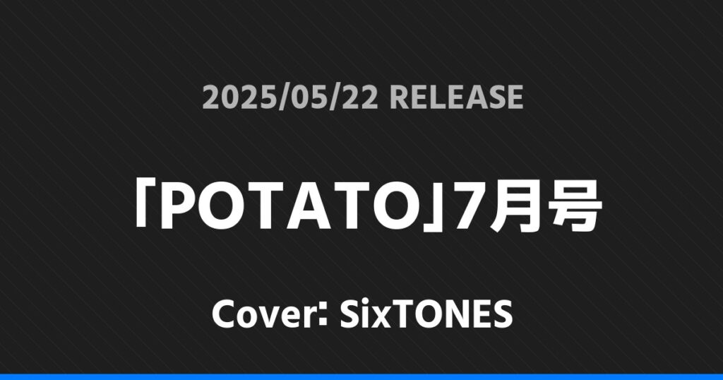 「POTATO」7月号表紙はSixTONES! SixTONES 2026.01.24 ※本ページにはプロモーションが含まれています。 商品リンク Amazon 楽天ブックス セブンネット タワーレコード 詳細情報 発売日:2025/05/22 表紙:SixTONES 「POTATO」7月号の表紙はSixTONESさんです! 「MAQUIA」7月号特別版表紙はtimelesz! 「週刊TVガイド」5/30号表紙はKis-My-Ft2! ホームSixTONES