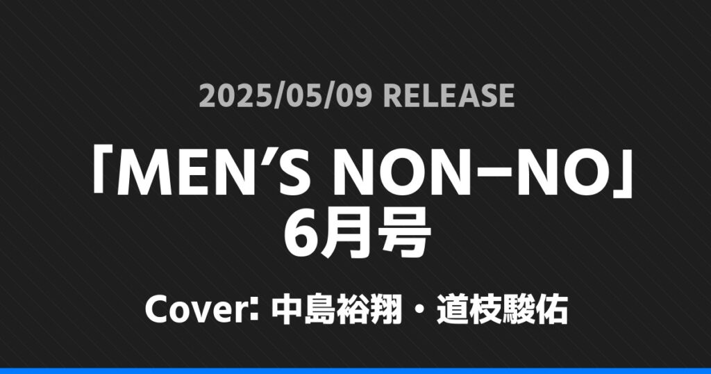 「MEN’S NON-NO」6月号表紙は中島裕翔・道枝駿佑! Hey! Say! JUMP 2026.01.24 ※本ページにはプロモーションが含まれています。 商品リンク Amazon 楽天ブックス セブンネット タワーレコード 詳細情報 発売日:2025/05/09 表紙:中島裕翔・道枝駿佑 「MEN’S NON-NO」6月号の表紙は中島裕翔・道枝駿佑さんです! 「FINEBOYS」6月号表紙はAぇ! group! 「週刊TVガイド」5/23号表紙は佐野晶哉・松本若菜! ホームHey! Say! JUMP