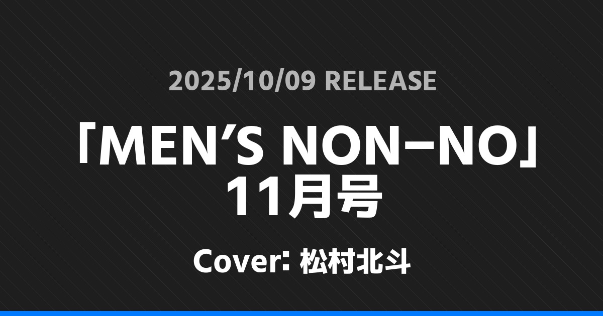 「MEN’S NON-NO」11月号表紙は松村北斗! SixTONES 2026.01.24 ※本ページにはプロモーションが含まれています。 商品リンク Amazon 楽天ブックス セブンネット タワーレコード 詳細情報 発売日:2025/10/09 表紙:松村北斗 「MEN’S NON-NO」11月号の表紙は松村北斗さんです! 「FINEBOYS」11月号表紙は目黒蓮! 「週刊TVガイド」10/17号表紙は松村北斗! ホームSixTONES