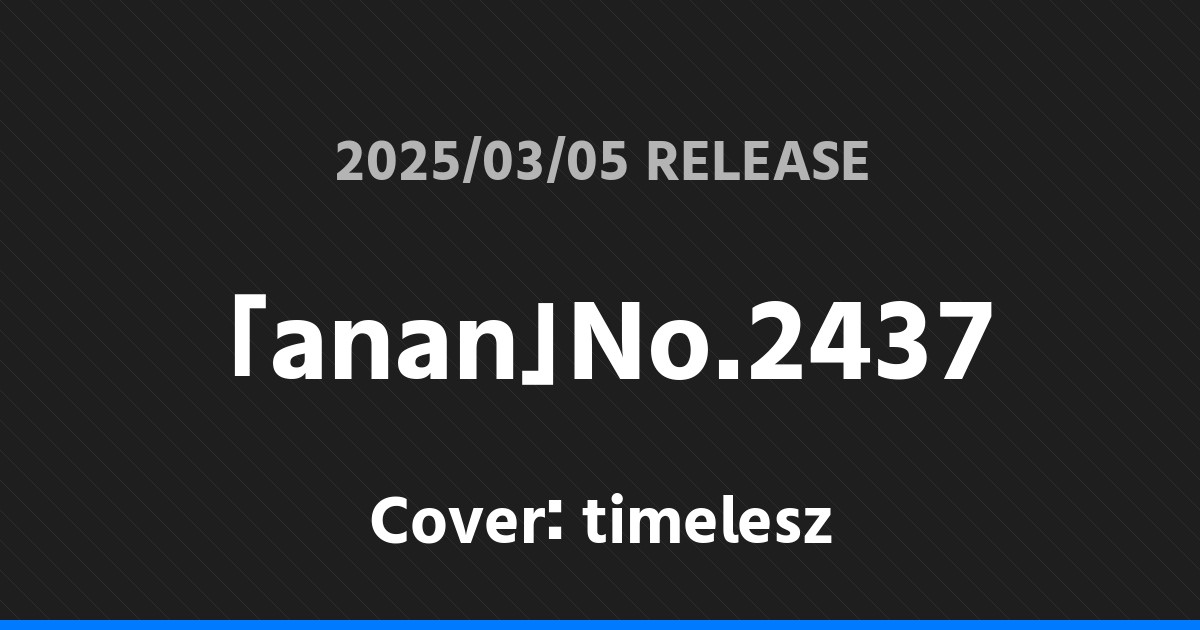 「anan」No.2437表紙はtimelesz! timelesz 2026.01.24 ※本ページにはプロモーションが含まれています。 商品リンク Amazon 楽天ブックス セブンネット タワーレコード 詳細情報 発売日:2025/03/05 表紙:timelesz 「anan」No.2437の表紙はtimeleszさんです! 「週刊TVガイド」3/14号表紙はTravis Japan! 「andGIRL2025年春号増刊」表紙は宮近海斗・松倉海斗・七五三掛龍也! ホームtimelesz