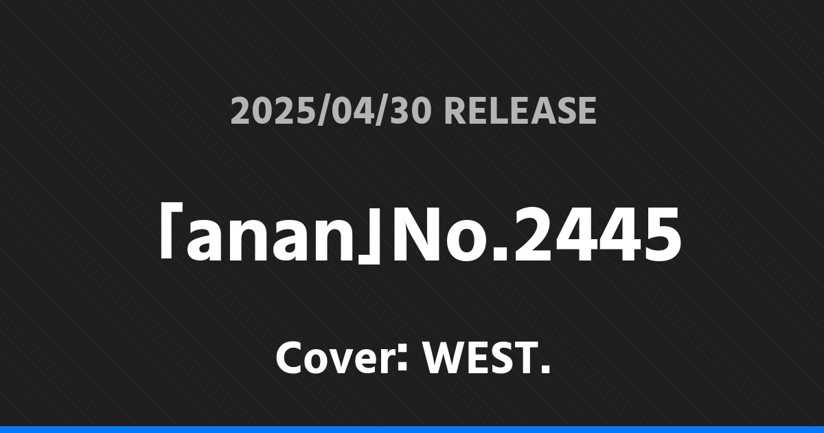 「anan」No.2445表紙はWEST.! WEST. 2026.01.24 ※本ページにはプロモーションが含まれています。 商品リンク Amazon 楽天ブックス セブンネット タワーレコード 詳細情報 発売日:2025/04/30 表紙:WEST. 「anan」No.2445の表紙はWEST.さんです! 「Depth EDITION 07」表紙は京本大我! 「週刊TVガイド」5/9号表紙は渡辺翔太・広瀬アリス! ホームWEST.
