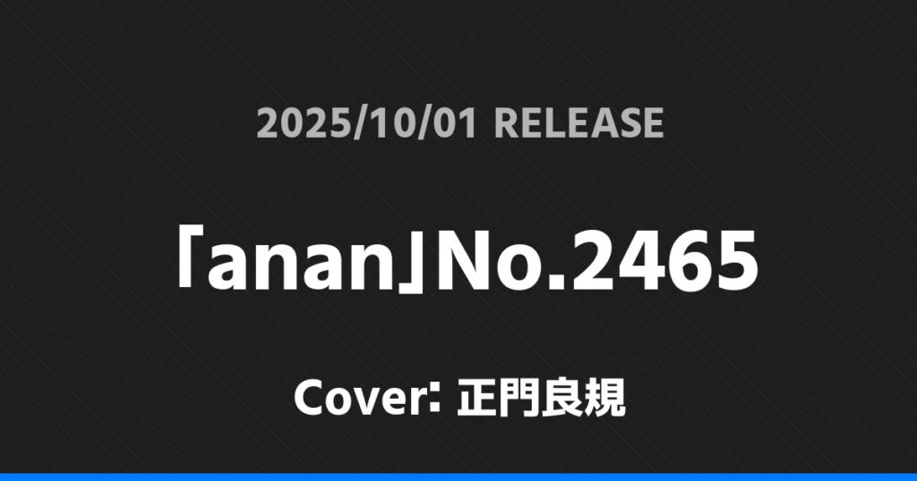 「anan」No.2465表紙は正門良規! Aぇ! group 2026.01.24 ※本ページにはプロモーションが含まれています。 商品リンク Amazon 楽天ブックス セブンネット タワーレコード 詳細情報 発売日:2025/10/01 表紙:正門良規 「anan」No.2465の表紙は正門良規さんです! 「CHEER」Vol.62表紙は向井康二・森崎ウィン! 「J Movie Magazine」Vol.123表紙は向井康二・森崎ウィン! ホームAぇ! group