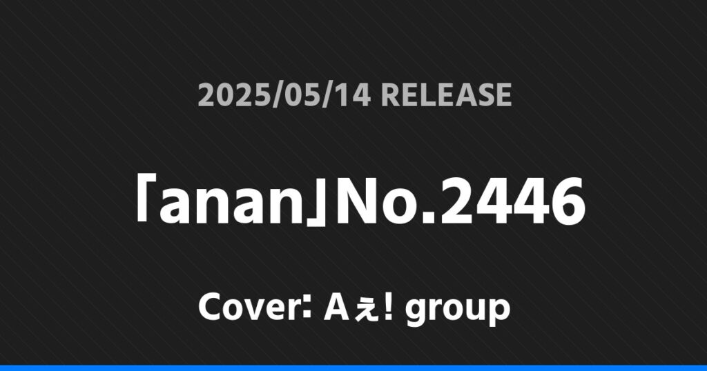 「anan」No.2446表紙はAぇ! group! Aぇ! group 2026.01.24 ※本ページにはプロモーションが含まれています。 商品リンク Amazon 楽天ブックス セブンネット タワーレコード 詳細情報 発売日:2025/05/14 表紙:Aぇ! group 「anan」No.2446の表紙はAぇ! groupさんです! 「週刊TVガイド」5/23号表紙は佐野晶哉・松本若菜! 「STAGE navi」vol.101表紙は寺西拓人・太田基裕! ホームAぇ! group
