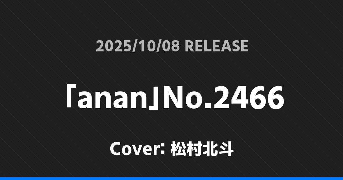 「anan」No.2466表紙は松村北斗! SixTONES 2026.01.24 ※本ページにはプロモーションが含まれています。 商品リンク Amazon 楽天ブックス セブンネット タワーレコード 詳細情報 発売日:2025/10/08 表紙:松村北斗 「anan」No.2466の表紙は松村北斗さんです! 「週刊TVガイド」10/17号表紙は松村北斗! 「PICT-UP」12月号表紙は佐久間大介! ホームSixTONES