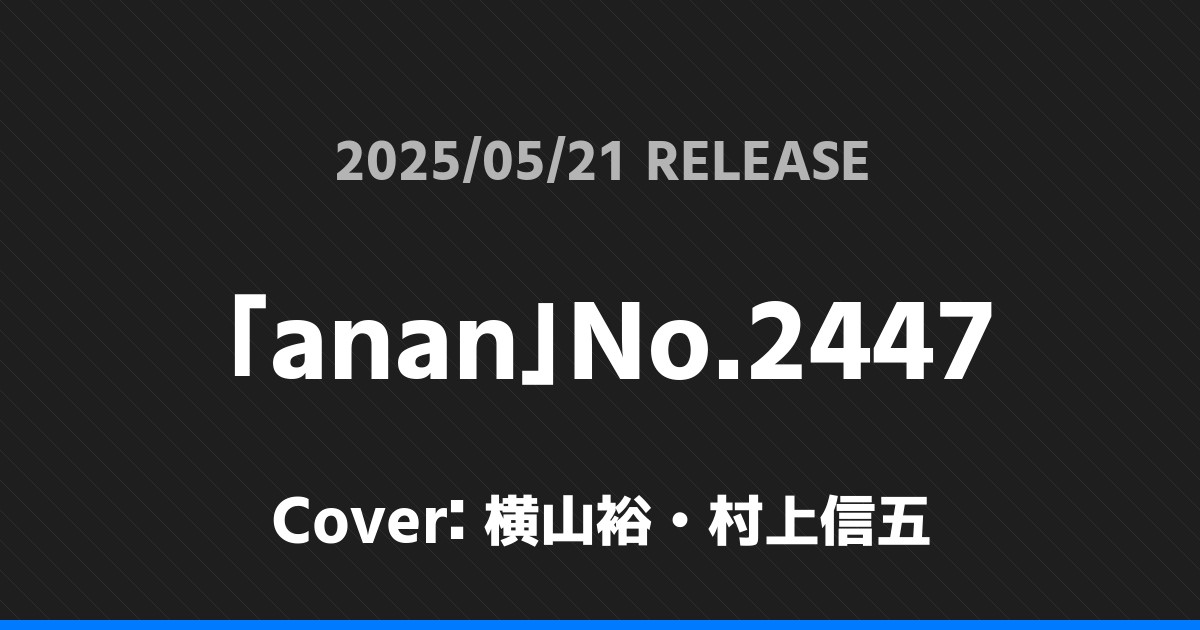 「anan」No.2447表紙は横山裕・村上信五! SUPER EIGHT 2026.01.24 ※本ページにはプロモーションが含まれています。 商品リンク Amazon 楽天ブックス セブンネット タワーレコード 詳細情報 発売日:2025/05/21 表紙:横山裕・村上信五 「anan」No.2447の表紙は横山裕・村上信五さんです! 「週刊TVガイド」5/30号表紙はKis-My-Ft2! 「東京カレンダー」7月号特別増刊表紙は山田涼介! ホームSUPER EIGHT