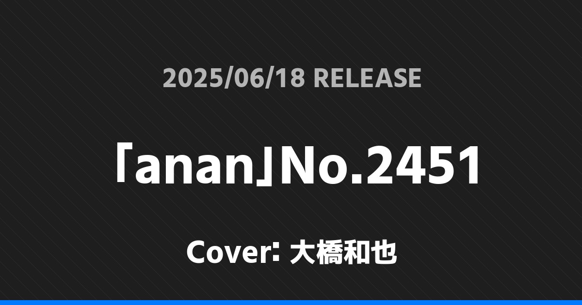 「anan」No.2451表紙は大橋和也! なにわ男子 2026.01.24 ※本ページにはプロモーションが含まれています。 商品リンク Amazon 楽天ブックス セブンネット タワーレコード 詳細情報 発売日:2025/06/18 表紙:大橋和也 「anan」No.2451の表紙は大橋和也さんです! 「週刊TVガイド」6/27号表紙は松本潤! 「madame FIGARO japon」8月号表紙は道枝駿佑! ホームなにわ男子