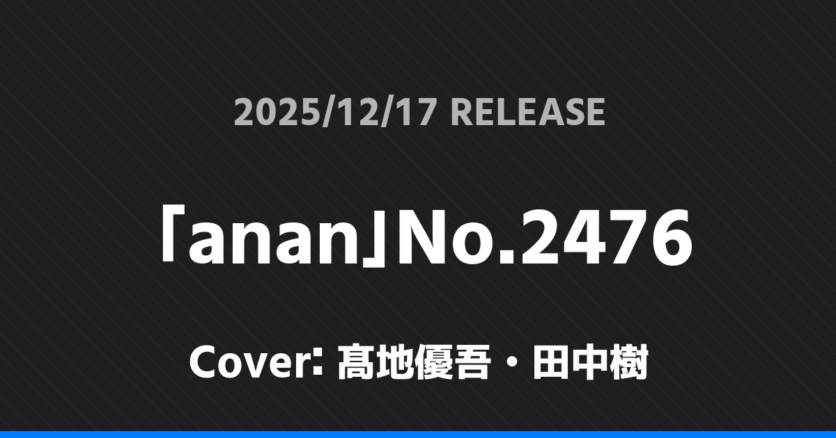 「anan」No.2476表紙は髙地優吾・田中樹! SixTONES 2026.01.24 ※本ページにはプロモーションが含まれています。 商品リンク Amazon 楽天ブックス セブンネット タワーレコード 詳細情報 発売日:2025/12/17 表紙:髙地優吾・田中樹 「anan」No.2476の表紙は髙地優吾・田中樹さんです! 「月刊テレビナビ」2月号表紙は木村拓哉! 「TVfan」2月号表紙はSnow Man! ホームSixTONES