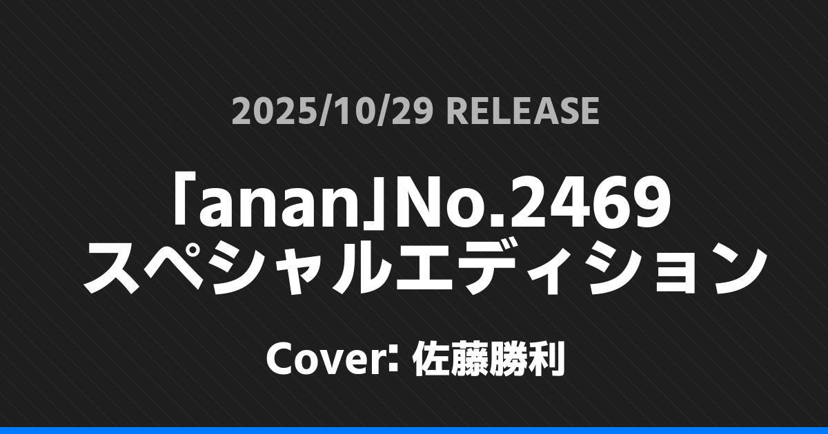 「anan」No.2469 スペシャルエディション表紙は佐藤勝利! timelesz 2026.01.24 ※本ページにはプロモーションが含まれています。 商品リンク Amazon 楽天ブックス セブンネット タワーレコード 詳細情報 発売日:2025/10/29 表紙:佐藤勝利 「anan」No.2469 スペシャルエディションの表紙は佐藤勝利さんです! 「週刊TVガイド」11/7号表紙は向井康二! 「TVLIFE」11/14号表紙は目黒蓮・妻夫木聡! ホームtimelesz