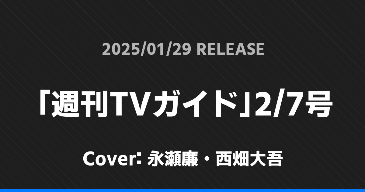 「週刊TVガイド」2/7号表紙は永瀬廉・西畑大吾! King & Prince 2026.01.24 ※本ページにはプロモーションが含まれています。 商品リンク Amazon 楽天ブックス セブンネット タワーレコード 詳細情報 発売日:2025/01/29 表紙:永瀬廉・西畑大吾 「週刊TVガイド」2/7号の表紙は永瀬廉・西畑大吾さんです! 「NYLON JAPAN」3月号表紙はAぇ! group! 「anan」No.2432表紙は松田元太! ホームKing & Prince