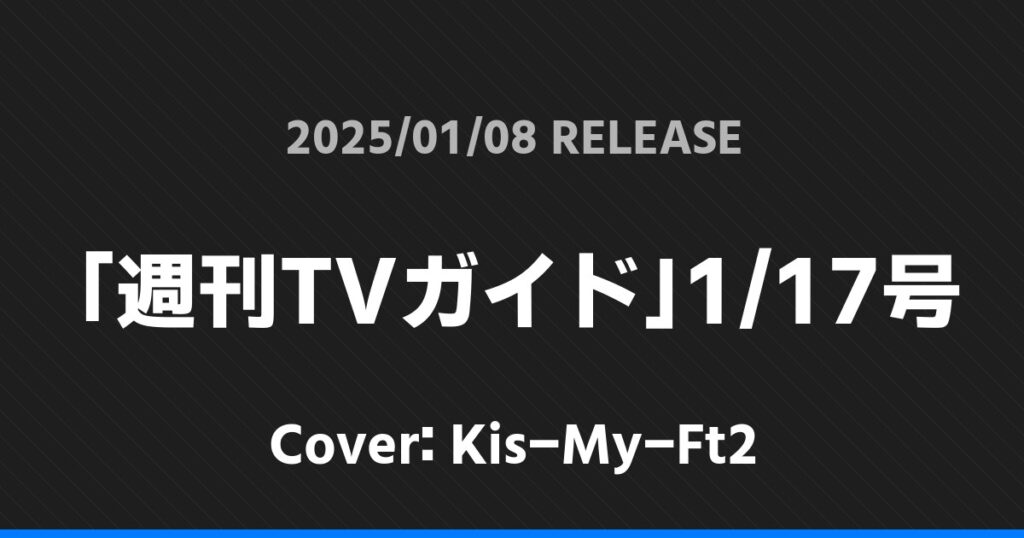 「週刊TVガイド」1/17号表紙はKis-My-Ft2! Kis-My-Ft2 2026.01.24 ※本ページにはプロモーションが含まれています。 商品リンク Amazon 楽天ブックス セブンネット タワーレコード 詳細情報 発売日:2025/01/08 表紙:Kis-My-Ft2 「週刊TVガイド」1/17号の表紙はKis-My-Ft2さんです! 「音楽と人」2月号表紙はジェシー・田中樹! 「anan」2429号表紙はSixTONES! ホームKis-My-Ft2