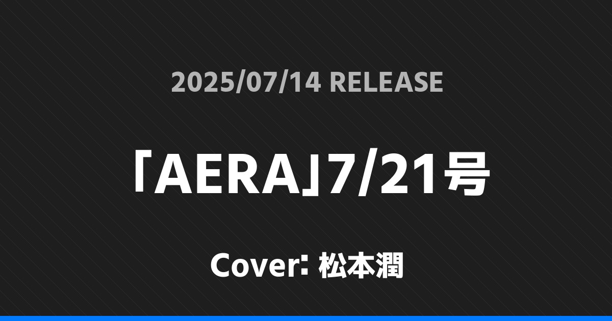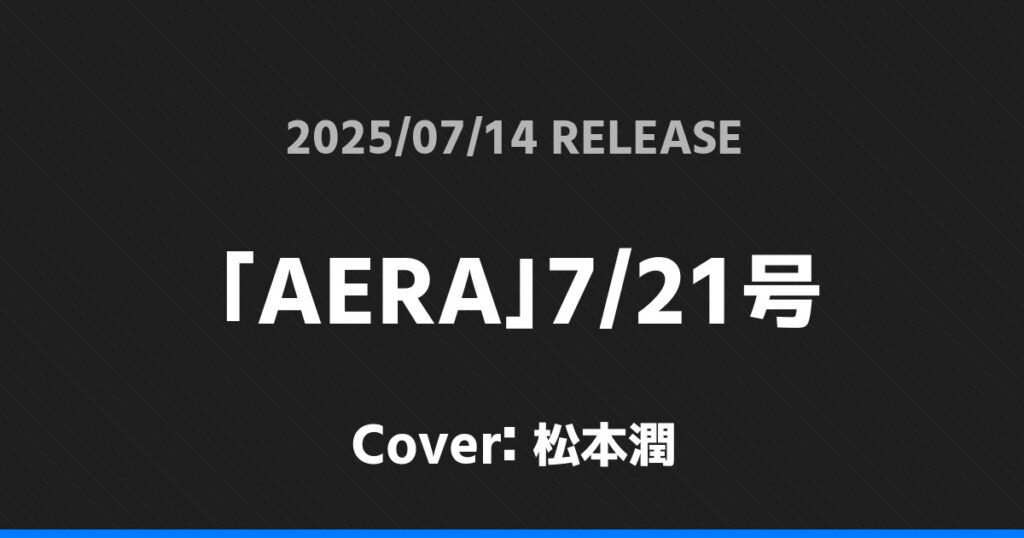 「AERA」7/21号表紙は松本潤! 嵐 2026.01.24 ※本ページにはプロモーションが含まれています。 商品リンク Amazon 楽天ブックス セブンネット タワーレコード 詳細情報 発売日:2025/07/14 表紙:松本潤 「AERA」7/21号の表紙は松本潤さんです! 「QLAP!」8月号表紙は渡辺翔太! 「non-no」9月号増刊表紙は渡辺翔太! ホーム嵐