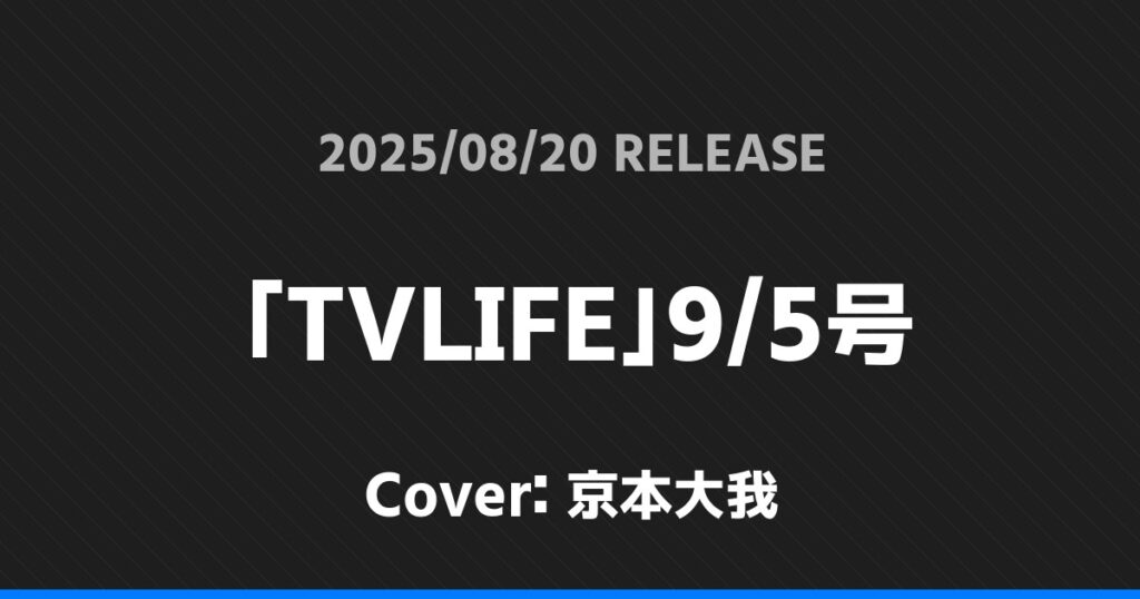 「TVLIFE」9/5号表紙は京本大我! SixTONES 2026.01.24 ※本ページにはプロモーションが含まれています。 商品リンク Amazon 楽天ブックス セブンネット タワーレコード 詳細情報 発売日:2025/08/20 表紙:京本大我 「TVLIFE」9/5号の表紙は京本大我さんです! 「キネマ旬報」9月号表紙は二宮和也! 「週刊TVガイド」8/29号表紙は髙地優吾! ホームSixTONES